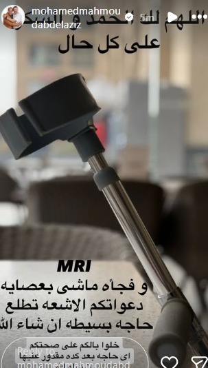 وشارك محمد محمود عبدالعزيز، صورة تظهر استعانته بعكاز للمشي وذلك عبر "ستوري" حسابه الرسمي على موقع الصور والفيديوهات الشهير "إنستجرام"، وعلق عليها بنبرة يملؤها الرضا قائلاً: “الحمد لله على كل حال، وفجأة ماشي بـ عصاية، دعواتكم الأشعة تطلع حاجة بسيطة إن شاء الله، خلوا بالكم على صحتكم، أي حاجة بعد كده مقدور عليها”.