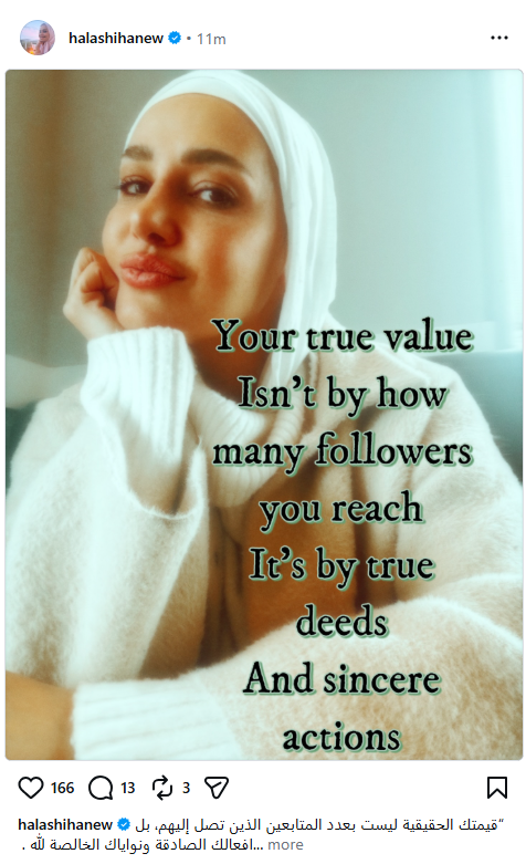 ونشرت حلا شيحة صورة حديثة لها، أرفقتها بتعليق لافت قالت فيه: “قيمتك الحقيقية ليست بعدد المتابعين الذين تصل إليهم، بل أفعالك الصادقة ونواياك الخالصة لله”، في رسالة فسّرها البعض على أنها نقد غير مباشر لثقافة “الأرقام” التي تسيطر على مواقع التواصل الاجتماعي، بينما ذهب آخرون إلى محاولة الربط بينها وبين مواقف أو أشخاص بعينهم، دون أن تكشف الفنانة عن المقصود برسالتها.