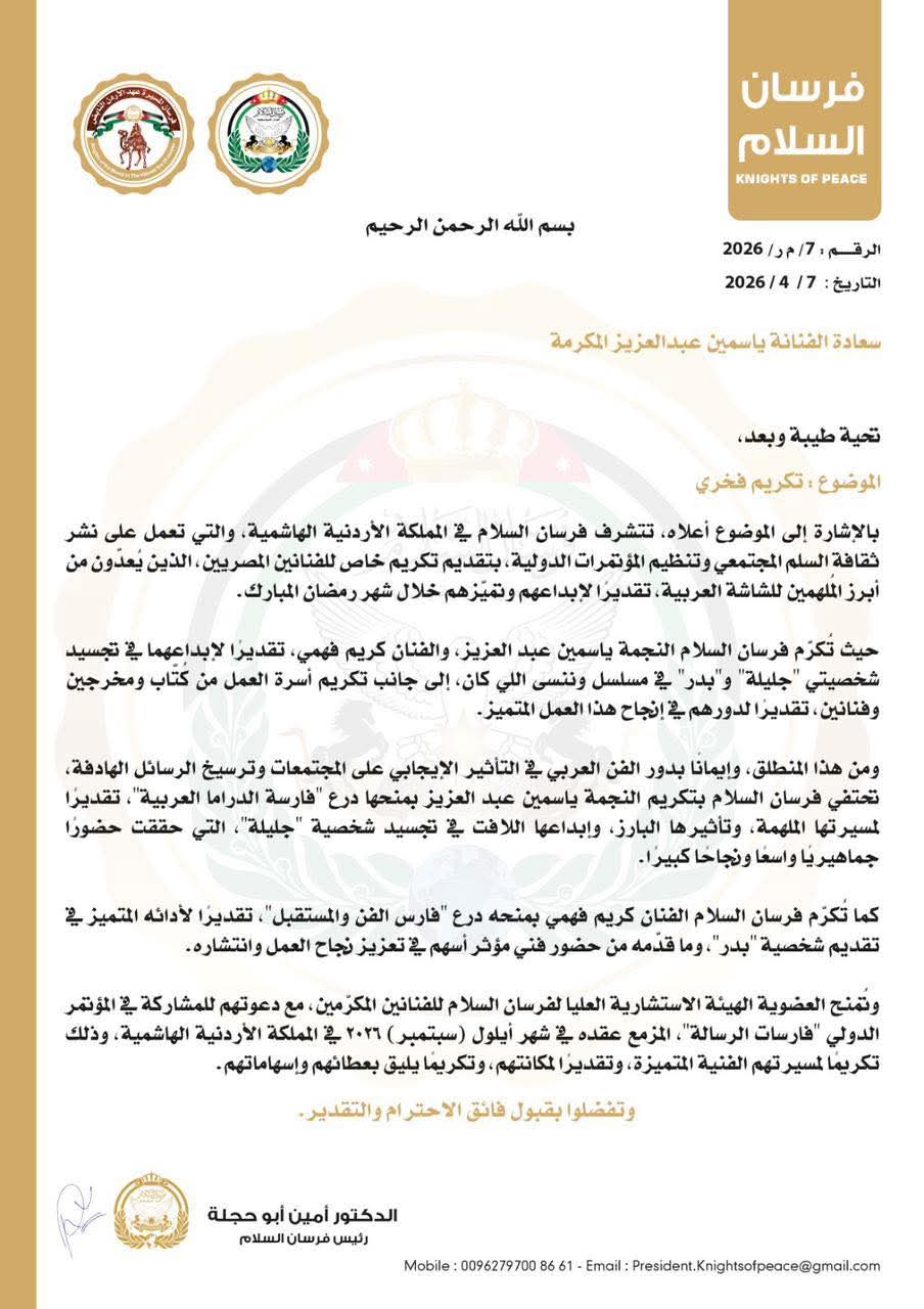 وشاركت ياسمين عبدالعزيز جمهورها لحظة التكريم من خلال منشور عبر حسابها الرسمي على موقع “فيسبوك”، حيث علّقت قائلة: “تكريم فخري من فرسان السلام من المملكة الأردنية الهاشمية.. ألف شكر”، في رسالة قصيرة عبّرت من خلالها عن امتنانها لهذه اللفتة والتقدير الذي حظيت به خارج مصر.