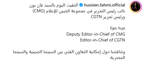 وكتب حسين فهمي: " التقيت اليوم بالسيد فان يون نائب رئيس التحرير في مجموعة الصين للإعلام (CMG) ورئيس تحرير CGTN، وتناقشنا حول إمكانية التعاون الفني بين السينما الصينية والسينما المصرية".