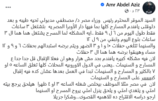 وأوضح عبد العزيز، في رساله له من خلال حسابه الرسمي بموقع التواصل الأجتماعي "فيس بوك"، أن المسارح في مصر، بما في ذلك دار الأوبرا المصرية، تقتصر ساعات عملها حاليًا على ثلاث ساعات فقط يوميًا، من السادسة إلى التاسعة مساءً، متسائلًا عن سبب عدم تعديل هذه المواعيد لتبدأ من التاسعة وحتى منتصف الليل، بما يتناسب مع طبيعة يوم المواطن المصري.
