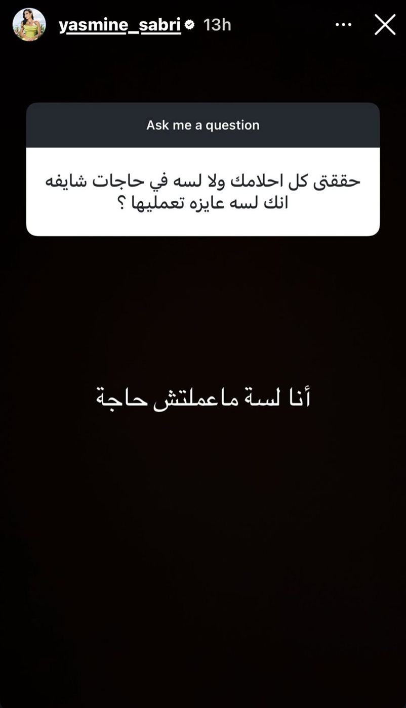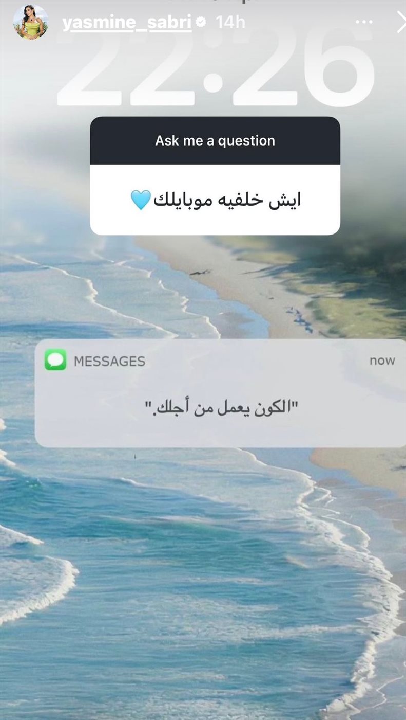 كما ردت ياسمين صبري على سؤال أحد المتابعين بشأن خلفية هاتفها، حيث كشفت عن صورة تحمل رسالة إيجابية مكتوب عليها: "الكون بيعمل من أجلك"، في إشارة منها إلى تبنيها أفكارًا تحفيزية تعكس نظرتها المتفائلة للحياة.