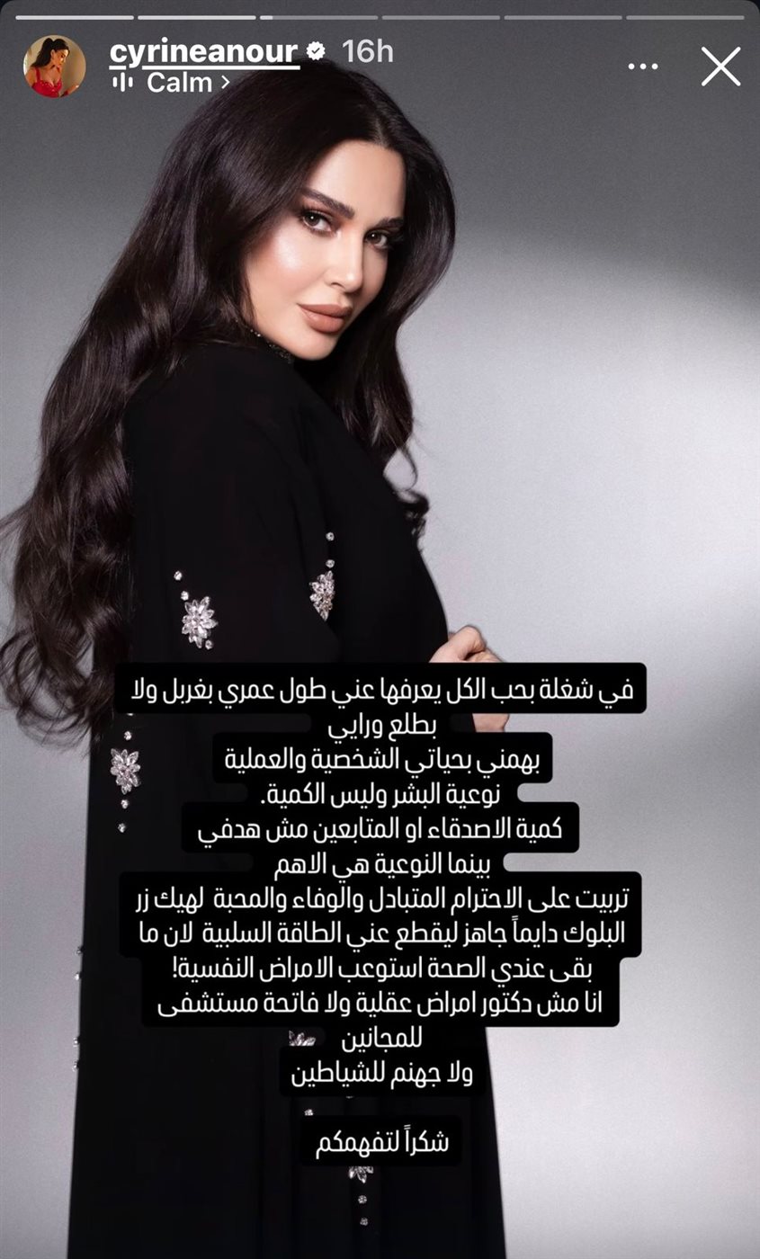 وتابعت: " تربيت على الاحترام المتبادَل والمحبة والوفاء، لهيك زر البلوك دايماً جاهز ليقطع عني الطاقة السلبية لأن ما بقى عندي صحة استوعب الأمراض النفسية! أنا مش دكتور أمراض عقلية ولا فاتحة مستشفى للمجانين ولا جهنم للشياطين. شكراً لتفهّمكم".