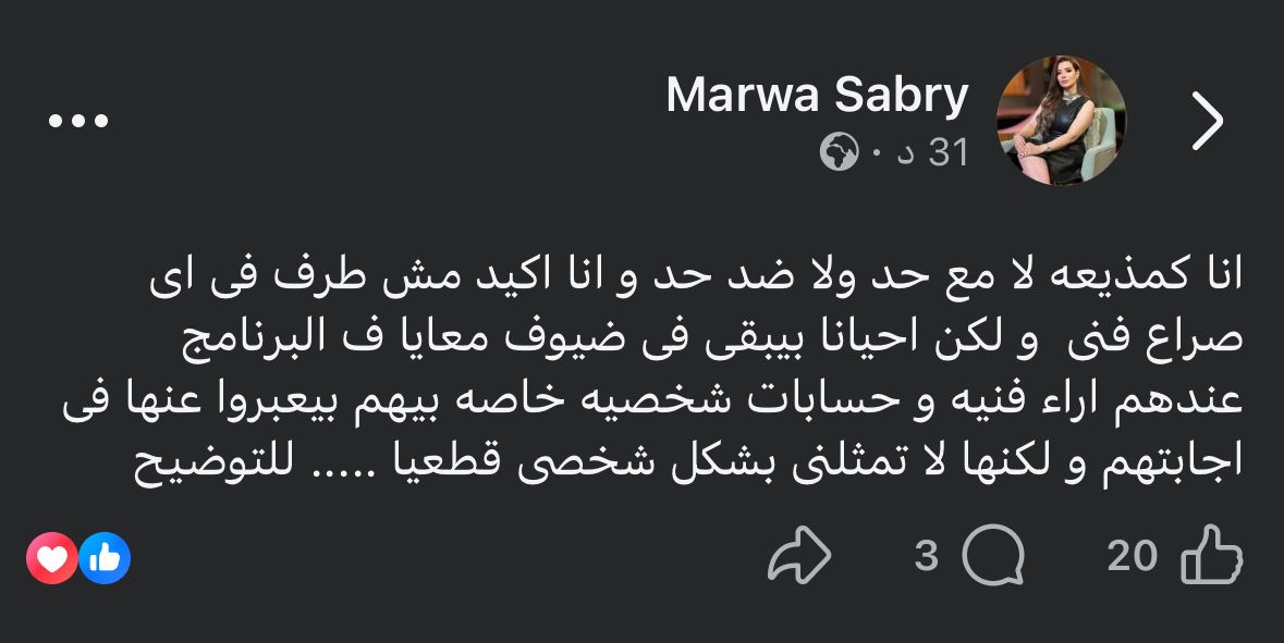 وأكد مروة صبري، في منشور لها عبر صفحتها على موقع التواصل الاجتماعي "فيسبوك"، أنها ليست مع أو ضد أي طرف من ضيوفها، ولكنها فقط تنقل الأراء للجمهور من خلال الحوار، قائلة: "أنا كمذيعه لا مع حد ولا ضد حد، وأنا أكيد مش طرف فى أى صراع فنى، ولكن أحيانًا بيبقى فى ضيوف معايا في البرنامج عندهم أراء فنية وحسابات شخصية خاصة بيهم بيعبروا عنها فى إجابتهم ولكنها لا تمثلنى بشكل شخصى قطعيًا، للتوضيح".