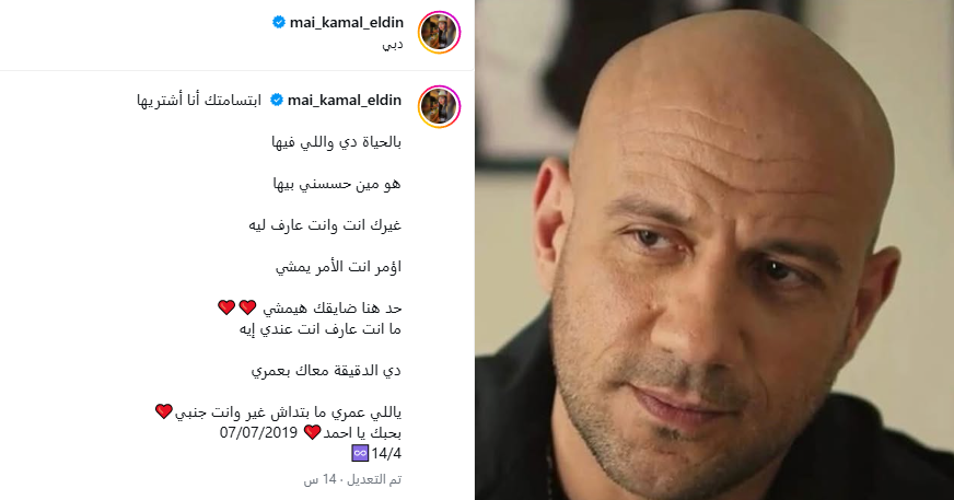 فقد نشرت خبيرة التجميل مي كمال الدين، صورة للفنان أحمد مكي عبر حسابها الرسمي وكتب رسالة رومانسية وقالت: