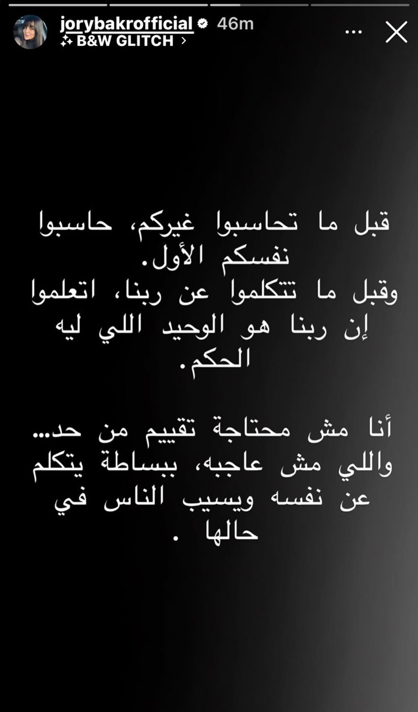 نشرت الفنانة جوري بكر رسالة مطولة عبر خاصية “الستوري” على حسابها الرسمي بموقع “إنستجرام”، وجهت خلالها هجومًا حادًا على بعض المتابعين بسبب تدخلهم في حياتها الشخصية والحكم عليها.