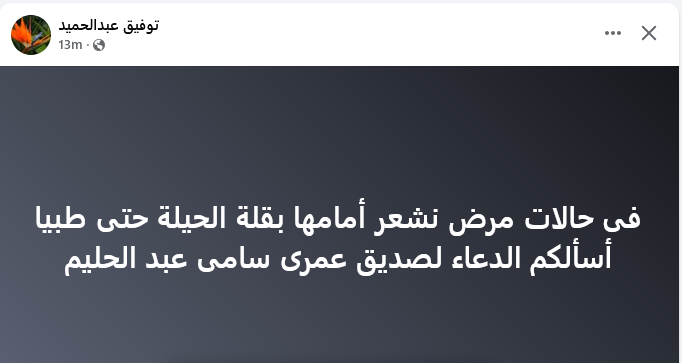وكتب توفيق عبد الحميد عبر صفحته الرسمية على موقع التواصل الاجتماعي "فيسبوك" منشورا دعم فيه سامي عبد الحليم، قائلا: "في حالات مرض نشعر أمامها بقلة الحيلة حتى طبيا.. أسألكم الدعاء لصديق عمري سامي عبد الحليم".