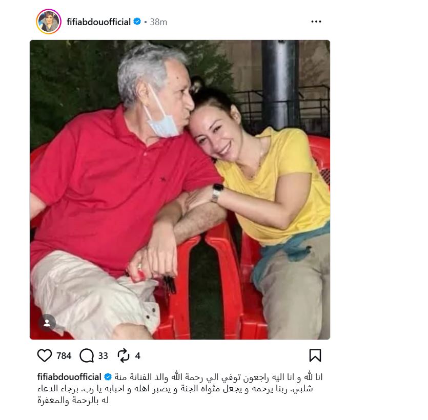 ونشرت فيفي عبده منشور لها عبر حسابها الرسمي على موقع التواصل الاجتماعي “الفيس بوك"، وعلقت قائلة: “إنا لله وإنا إليه راجعون، تُوفي إلى رحمة الله والد الفنانة منة شلبي، ربنا يرحمه ويجعل مثواه الجنة ويصبر أهله ولأحبابه يارب، برجاء الدعاء له بالرحمة والمغفرة”.