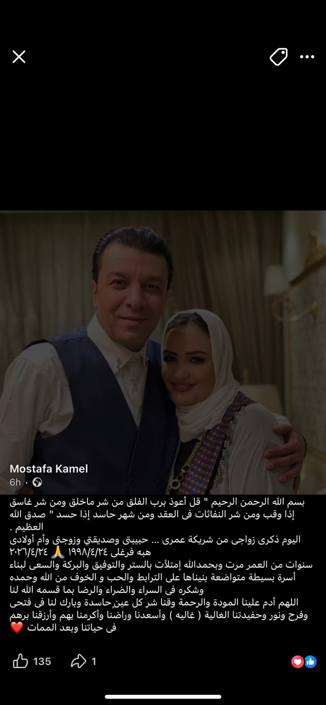 حرص الفنان مصطفى كامل على الاحتفال بذكرى زواجه إذ نشر صورة لزوجته ووجه لها رسالة رومانسية، مشيرًا إلى أنه شريكة نصف عمره.