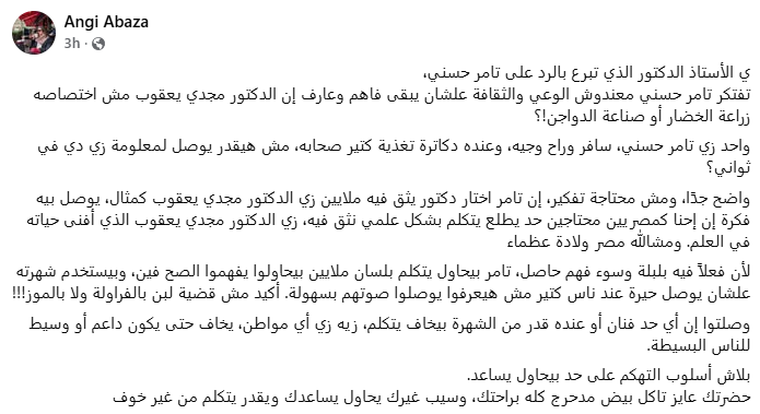 وقالت إنجي أباظة في منشور لها عبر حسابها الرسمي على موقع التواصل الاجتماعي "فيسبوك": "الأستاذ الدكتور الذي تبرع بالرد على تامر حسني، تفتكر تامر حسني معندوش الوعي والثقافة علشان يبقى فاهم وعارف إن الدكتور مجدي يعقوب مش اختصاصه زراعة الخضار أو صناعة الدواجن!؟، واحد زي تامر حسني، سافر وراح وجيه، وعنده دكاترة تغذية كتير صحابه، مش هيقدر يوصل لمعلومة زي دي في ثواني؟".