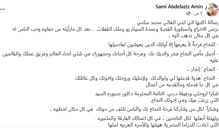 وأكد والد محمد سامي، في رسالته، أن نجاح نجله لم يكن مجرد إنجاز شخصي، بل هدية ثمينة لكل أفراد الأسرة، مشيرًا إلى حالة الحب والتقدير التي يلمسها من الجمهور في كل مكان، وهو ما يعكس تأثير أعماله وقربها من الناس.
