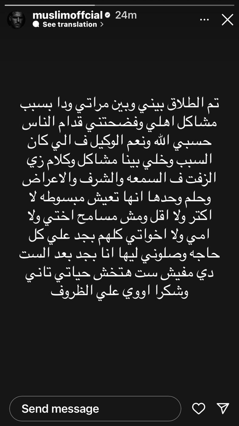 وفي منشور مؤثر، عبّر مسلم عن خيبة أمله العميقة، مؤكدًا أن حياته الزوجية تعرضت لضغوط هائلة بسبب الخلافات التي نشأت بين أسرته وزوجته، وتطورت الأمور لتصل إلى نقطة اللاعودة، حيث أشار إلى أن هذه الخلافات تجاوزت الحدود الشخصية لتطال سمعة الزوجة وشرفها، وهو ما اعتبره أمرًا لا يغتفر وشدد على أن كل ما كانت تتمناه زوجته هو حياة هادئة وسعيدة، بعيدًا عن المشاكل والضغوط، وهو ما لم تستطع الظروف أن توفره لها.