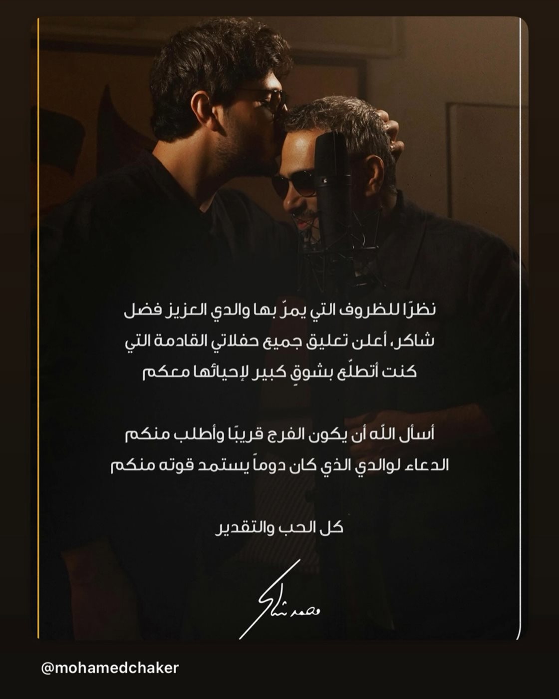 وقال محمد فضل شاكر خلال بيانه: "نظرا للظروف التي يمر بها والدي العزيز فضل شاكر أعلن تعليق جميع حفلاتي القادمة التي كنت أتطلع بشوق كبير لإحيائها معكم".