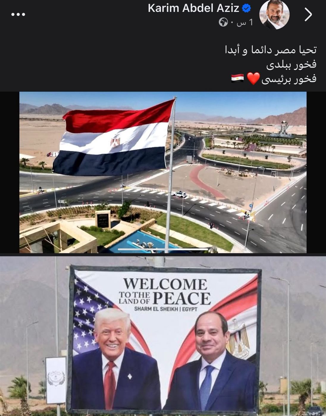ونشر كريم عبد العزيز صورة لشرم الشيخ، وصورة أخرى تجمع الرئيس السيسي بالرئيس الأمريكي دونالد ترامب، معلقا عليها: “تحيا مصر دائما وأبدا، فخور ببلدى، فخور برئيسى”.