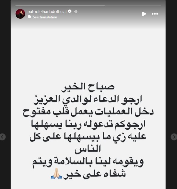 وذكرت بتول الحداد عبر خاصية "الاستوري" على "إنستجرام": "صباح الخير، أرجو الدعاء لوالدي العزيز، دخل العمليات يعمل قلب مفتوح، أرجوكم تدعوا له ربنا يسهلها عليه زي ما بيسهلها على كل الناس، ويقومه لينا بالسلامة ويتم شفاه على خير".