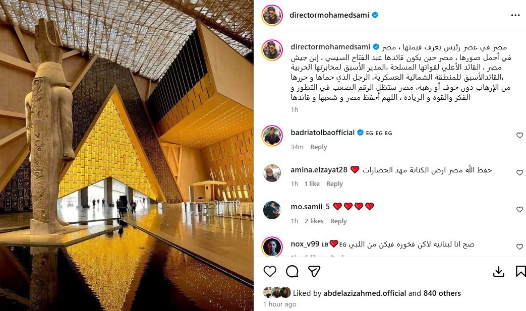 وقال سامي خلال حسابه على “إنستجرام”: إن المتحف المصري الكبير يُجسد رؤية القيادة السياسية في إبراز عظمة الحضارة المصرية أمام العالم، ويعكس إدراك الرئيس لقيمة مصر ومكانتها التاريخية والإنسانية.