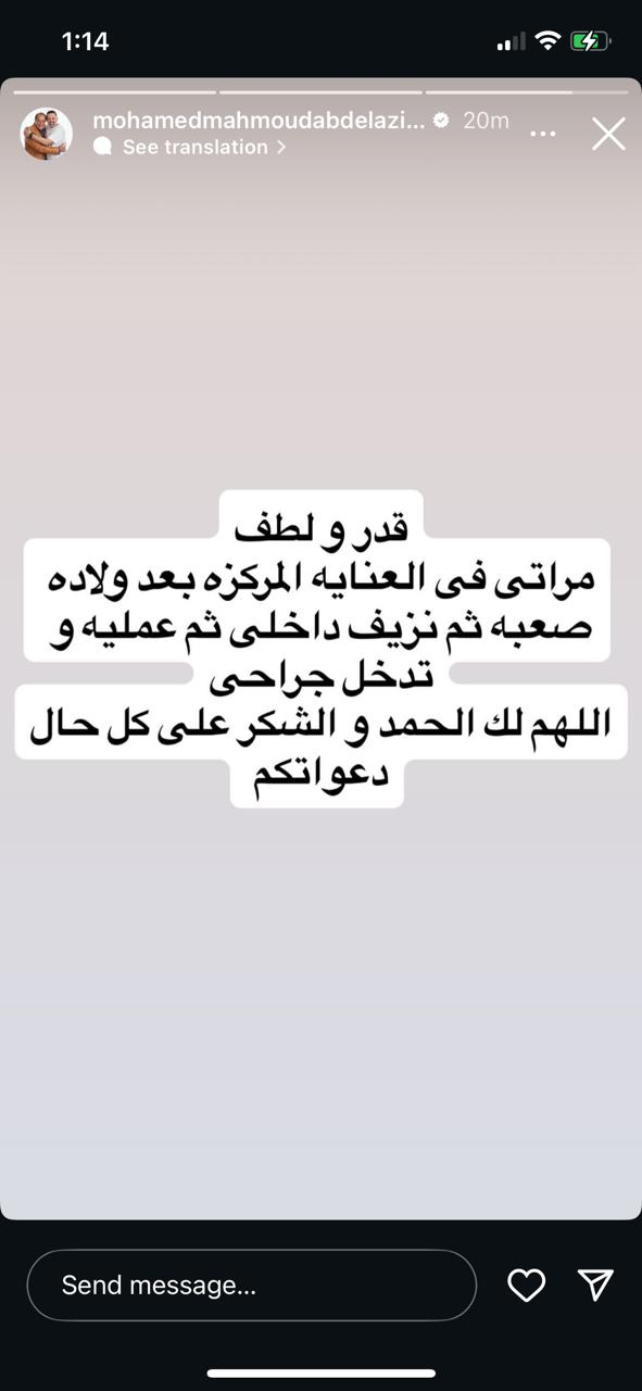 وكتب محمد محمود عبد العزيز، عبر خاصية "ستوري" على حسابه في "إنستجرام": "قدر ولطف، مراتي في العناية المركزة بعد ولادة صعبة، ثم نزيف داخلي ثم عملية وتدخل جراحي، اللهم لك الحمد والشكر على كل حال، دعواتكم".