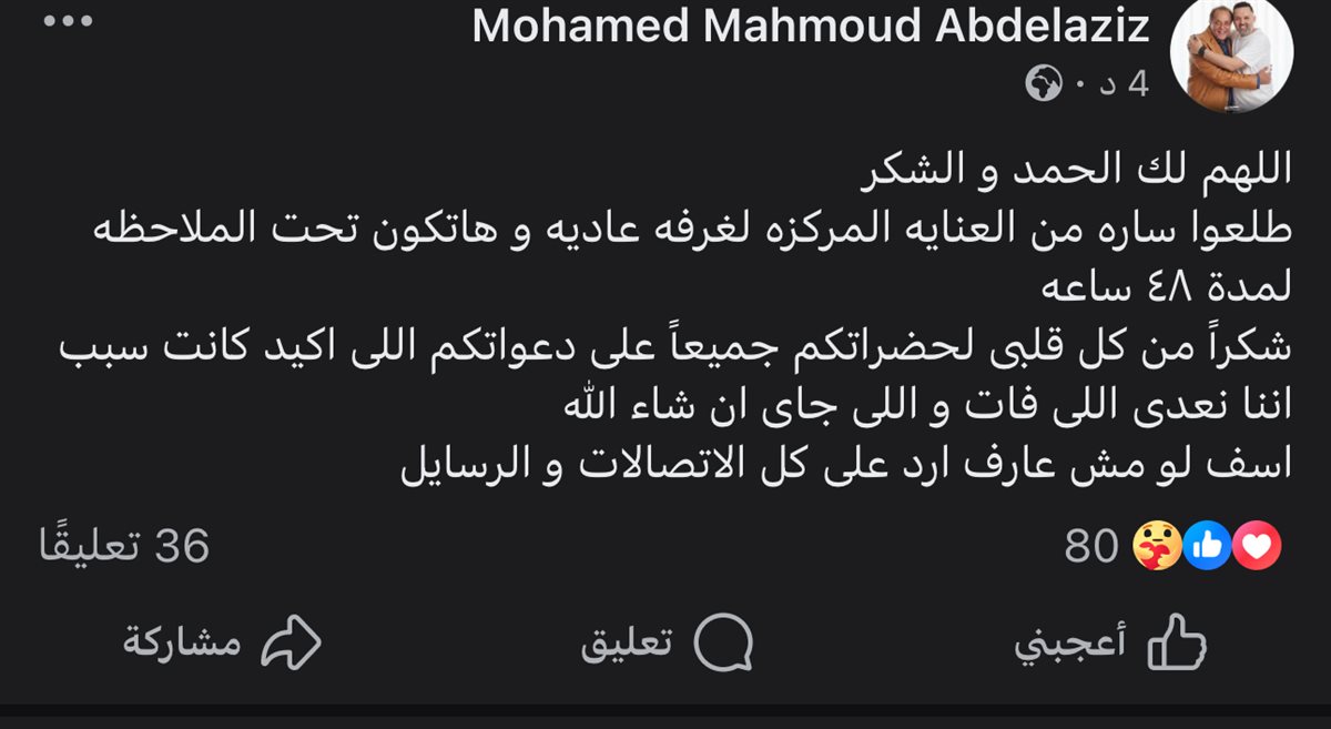 ووجّه محمد محمود عبد العزيز رسالة شكر وامتنان إلى جمهوره وأصدقائه، قائلاً: “اللهم لك الحمد والشكر، طلعوا سارة من العناية المركزة لغرفة عادية، وهتكون تحت الملاحظة لمدة ٤٨ ساعة، شكراً من كل قلبي لحضراتكم جميعاً على دعواتكم اللي أكيد كانت سبب إننا نعدي اللي فات واللي جاي إن شاء الله، آسف لو مش عارف أرد على كل الاتصالات والرسائل”.