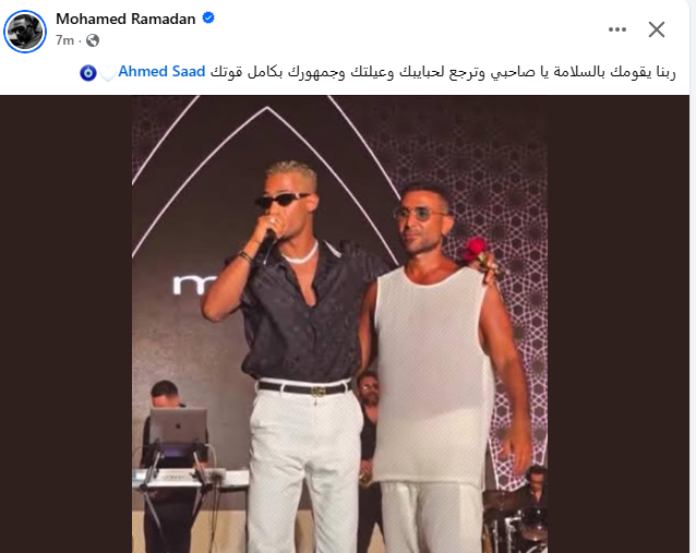 وجه الفنان محمد رمضان رسالة دعم لزميله أحمد سعد بعد تعرضه لحادث سير على طريق العين السخنة، إذ كتب عبر خاصية ستوري بحسابه على إنستجرام: "ربنا يطمنا عليك يا سعدة ويقومك بالسلامة لعيلتك وحبايبك".