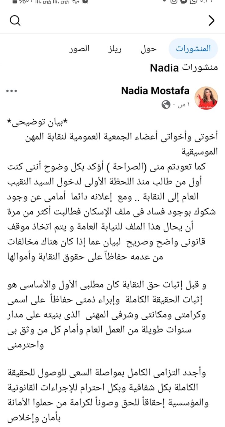 كشفت المطربة نادية مصطفى عضو مجلس نقابة المهن الموسيقية عن مطالبتها من قبل بإحالة ملف الإسكان داخل النقابة إلى النيابة مع الحديث عن وجود فساد به وذلك للرد علي هذا الأمر أمام الجميع، قائلة فى بيانها : "أخوتى وأخواتى أعضاء الجمعية العمومية لنقابة المهن الموسيقية، كما تعودتم منى (الصراحة ) أؤكد بكل وضوح أننى كنت أول من طالب منذ اللحظة الأولى لدخول السيد النقيب العام إلى النقابة .. ومع إعلانه دائما أمامى عن وجود شكوك بوجود فساد فى ملف الإسكان فطالبت أكثر من مرة أن يحال هذا الملف للنيابة العامة ويتم اتخاذ موقف قانونى واضح وصريح لبيان عما إذا كان هناك مخالفات من عدمه حفاظاً على حقوق النقابة وأموالها".