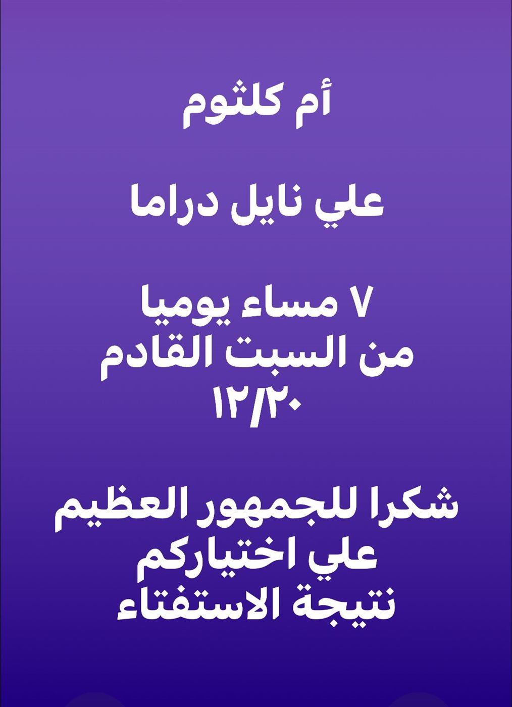 وكتب عمرو عابدين عبر صفحته الرسمية على موقع «فيس بوك»: «أم كلثوم على نايل دراما من السبت القادم 20/12.. شكرًا للجمهور العظيم على اختياركم نتيجة الاستفتاء»، في إشارة إلى الإقبال الجماهيري الكبير على إعادة عرض العمل الذي يُعد من أبرز الأعمال الدرامية في تاريخ التلفزيون المصري.