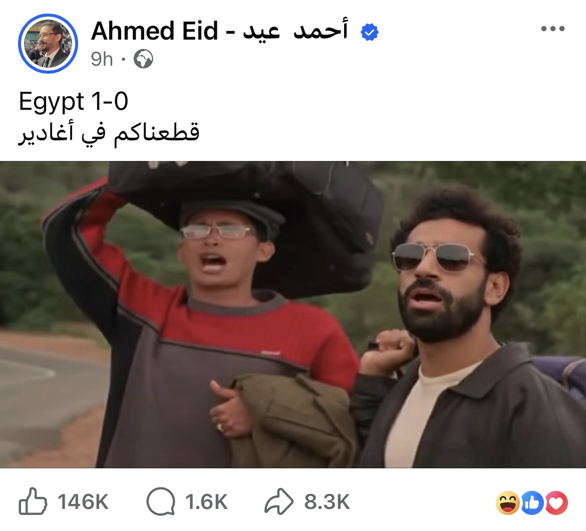 ونشر أحمد عيد، تعليقًا ساخرًا عبر حسابه الرسمي على موقع فيسبوك قال فيه: «Egypt 1-0، قطعناكم في أغادير»، في إشارة إلى المدينة المغربية التي استضافت المباراة، وهو ما لاقى تفاعلًا واسعًا من متابعيه.