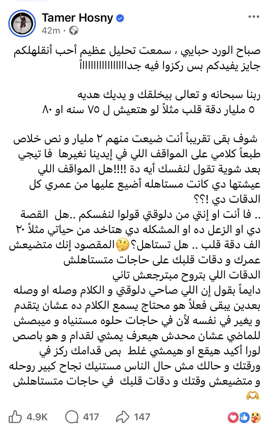 نشر الفنان تامر حسني، رسالة مؤثرة عبر صفحته الرسمية على موقع «فيسبوك»، تحدث فيها بصراحة وبأسلوبه الخاص عن قيمة العمر ودقات القلب، موجّهًا نصيحة مباشرة لجمهوره بعدم إهدار حياتهم في أمور لا تستحق