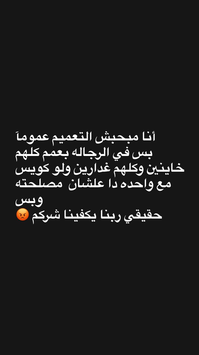 وتابعت في منشور آخر، قائلة: “أنا مبحبش التعميم.. بس في الرجالة بعمم.. كلهم خاينين وغدارين.. ربنا يكفينا شركم”.
