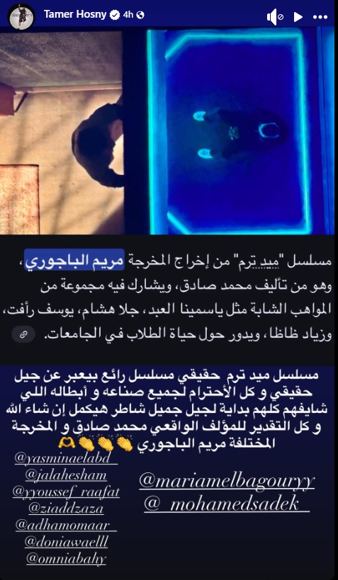 أشاد الفنان تامر حسني بمسلسل «ميدترم»، بطولة الفنانة ياسمينا العبد، مؤكدًا إعجابه الكبير بالعمل، ومشيرًا إلى أنه يعكس صورة حقيقية لجيل كامل، ويستحق كل الاحترام والتقدير لما يقدمه من محتوى واقعي وصادق.