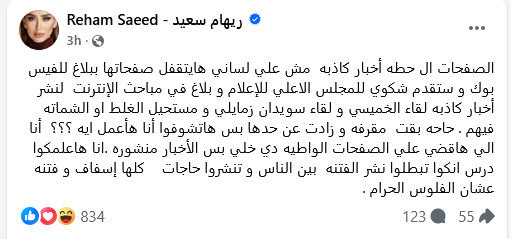وأكدت ريهام سعيد أنها لن تتهاون في حقها وستقوم بتقديم عدة بلاغات ضد هذه الصفحات قائلة: "الصفحات اللي حطه أخبار كاذبه مش علي لساني ها يتقفل صفحاتها ببلاغ للفيس بوك، وسأقدم شكوي للمجلس الاعلي للإعلام و لاغ في مباحث الإنترنت لنشر أخبار كاذبه لقاء الخميسي ولقاء سويدان زمايلي ومستحيل الغلط أو الشماته فيهم".