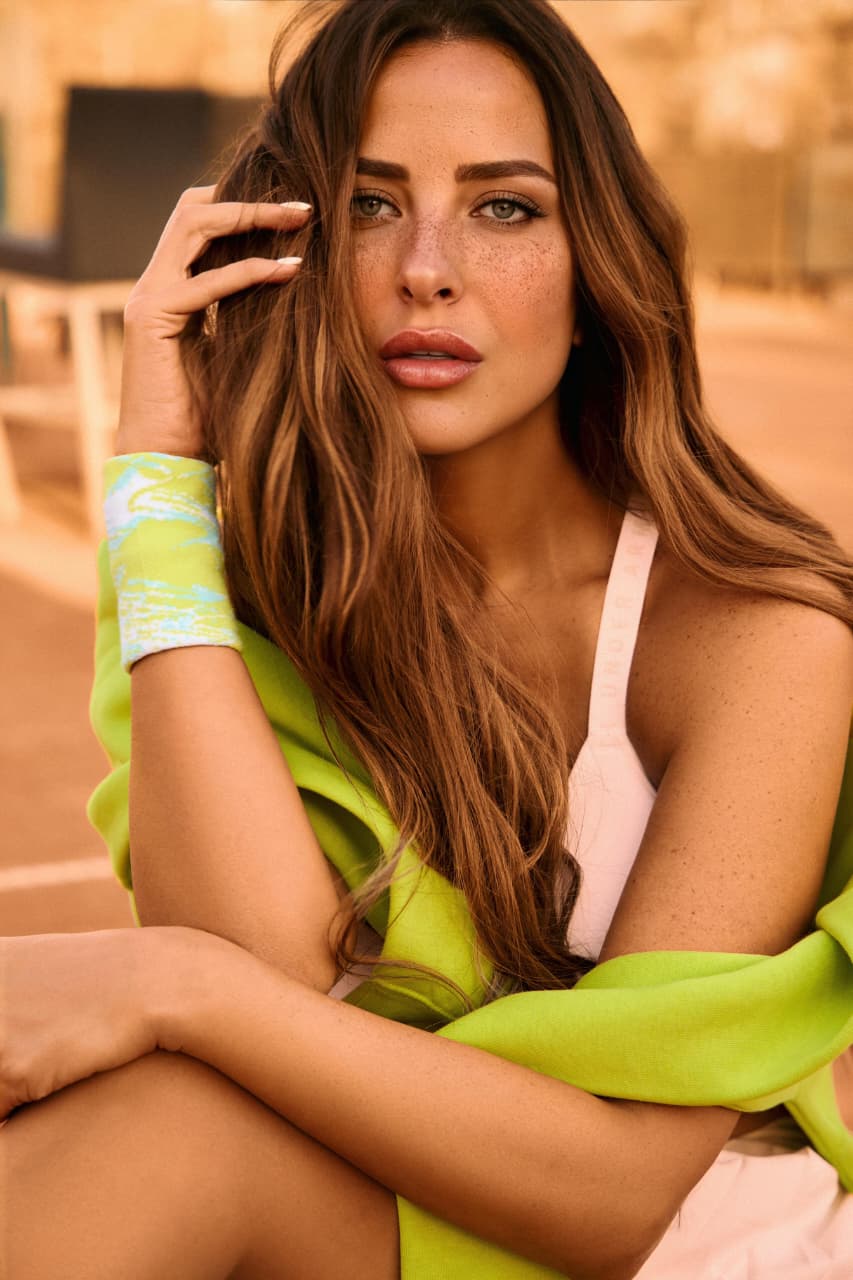 وظهرت ريم مصطفى خلال جلسة التصوير داخل أحد ملاعب التنس، مرتدية أزياء رياضية عصرية جمعت بين العملية والأناقة؛ إذ تنوعت إطلالاتها بين فستان تنس قصير باللونين الأسود والأبيض، مع حذاء رياضي وجوارب طويلة، إلى جانب إطلالة أخرى بكنزة رياضية قصيرة باللون الأخضر الفاتح مع تنورة بيضاء، كما اعتمدت إكسسوارات بسيطة ونظارة شمسية عصرية.