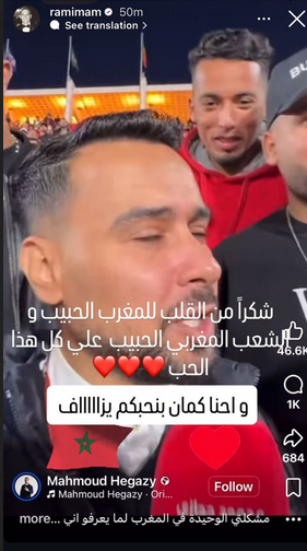 ونشر المخرج رامي إمام الفيديو على حسابه الرسمي في «إنستجرام» عبر خاصية «الستوري»، موجهًا رسالة شكر مؤثرة لشعب المغرب، معبرًا عن تقديره الكبير لمحبتهم، ومؤكدًا أن المشاعر المتبادلة بين العائلة والجمهور دائمًا ما تكون صادقة، قائلا: "شكرا من القلب للمغرب الحبيب والشعب المغربي الحبيب على كل هذا الحب، واحنا كمان بنحبكم بزاف".
