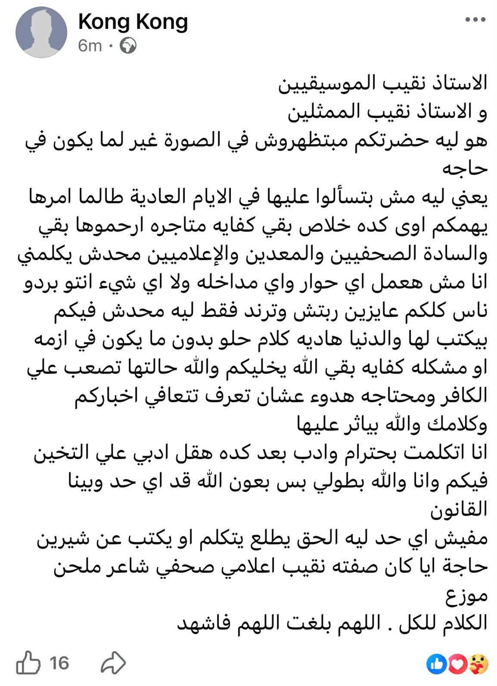 وتابع: "أنا اتكلمت بحترام وأدب بعد كده هقل أدبي علي التخين فيكم وأنا والله بطولي بس بعون الله قد أي حد وبينا القانون.. مفيش أي حد ليه الحق يطلع يتكلم أو يكتب عن شيرين حاجة أيا كان صفته نقيب اعلامي صحفي شاعر ملحن موزع الكلام للكل.. اللهم بلغت اللهم فاشهد".