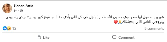 وقالت حنان عطية، عبر حسابها الرسمي على موقع التواصل الاجتماعي «فيسبوك»: «شيرين معمول لها سحر قوي، حسبي الله ونعم الوكيل في كل اللي يأذي حد، الموضوع كبير، ربنا يشفيكي يا حبيبتي وترجعي للناس اللي بتعشقك».