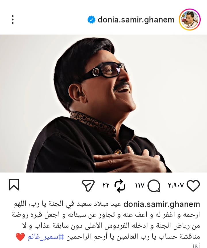 حرصت الفنانة دنيا سمير غانم على إحياء ذكرى عيد ميلاد والدها الفنان الراحل سمير غانم، وذلك من خلال منشور مؤثر عبر حسابها الرسمي على موقع «إنستجرام»، عبّرت فيه عن حبها واشتياقها له، وسط تفاعل واسع من جمهورها ومحبيه.
