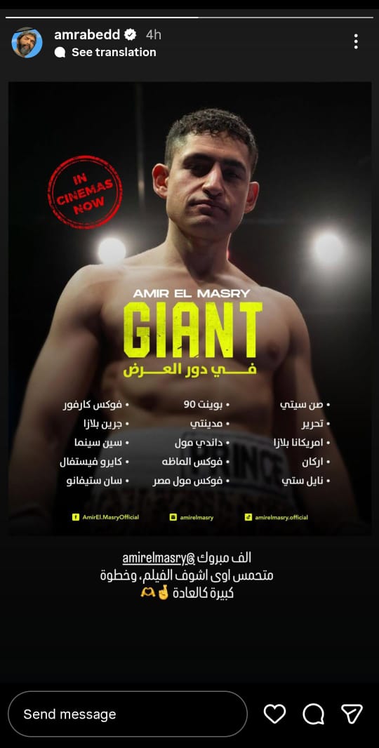 أبرزهم محمد دياب وأحمد داش وعمرو عابد.. نجوم الفن يشجعوا على مشاهدة فيلم giant لأمير المصري