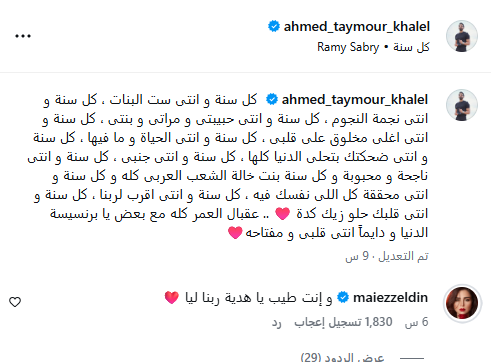 بدأت رسائل الحب من جانب أحمد تيمور، الذي كتب على حسابه الشخصي بموقع إنستجرام منشورًا مؤثرًا جاء فيه: "كل سنة وأنتِ ست البنات، كل سنة وأنتِ نجمة النجوم، كل سنة وأنتي حبيبتي ومراتي وبنتي، كل سنة وأنتِ أغلى مخلوق على قلبي، كل سنة وأنتي الحياة وما فيها، كل سنة وأنتِ ضحكتك بتحلى الدنيا كلها."