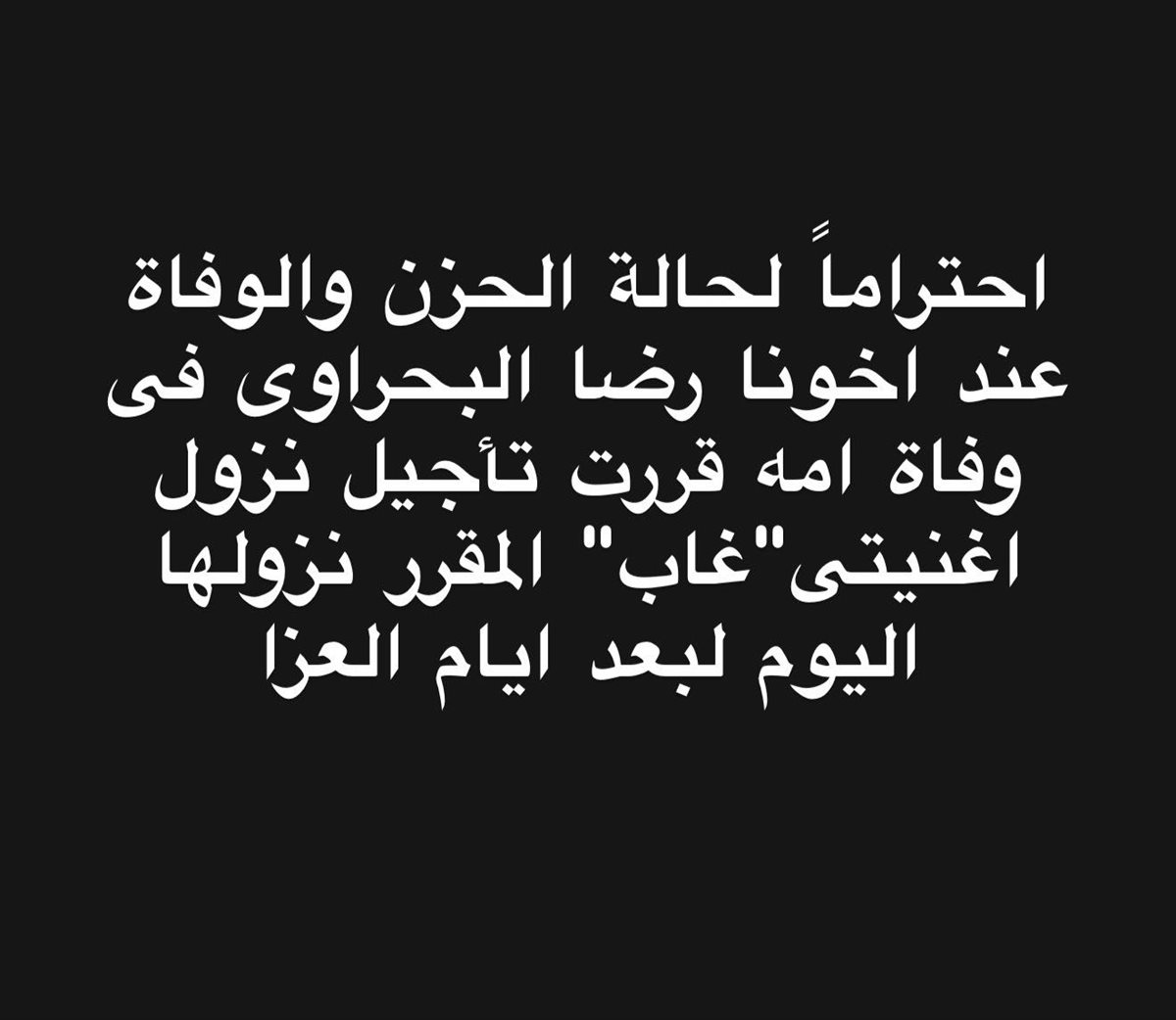 وكتب عمر كمال عبر حسابه الرسمي على موقع فيسبوك: "احترامًا لحالة الحزن والوفاة عند أخويا رضا البحراوي في وفاة أمه، قررت تأجيل نزول أغنيتي 'غاب' لبعد أيام العزاء"، مؤكّدًا أن القرار جاء من منطلق الأخوة والمودة بين الفنانين، ورغبة في احترام مشاعر رضا وعائلته في هذا الوقت العصيب.