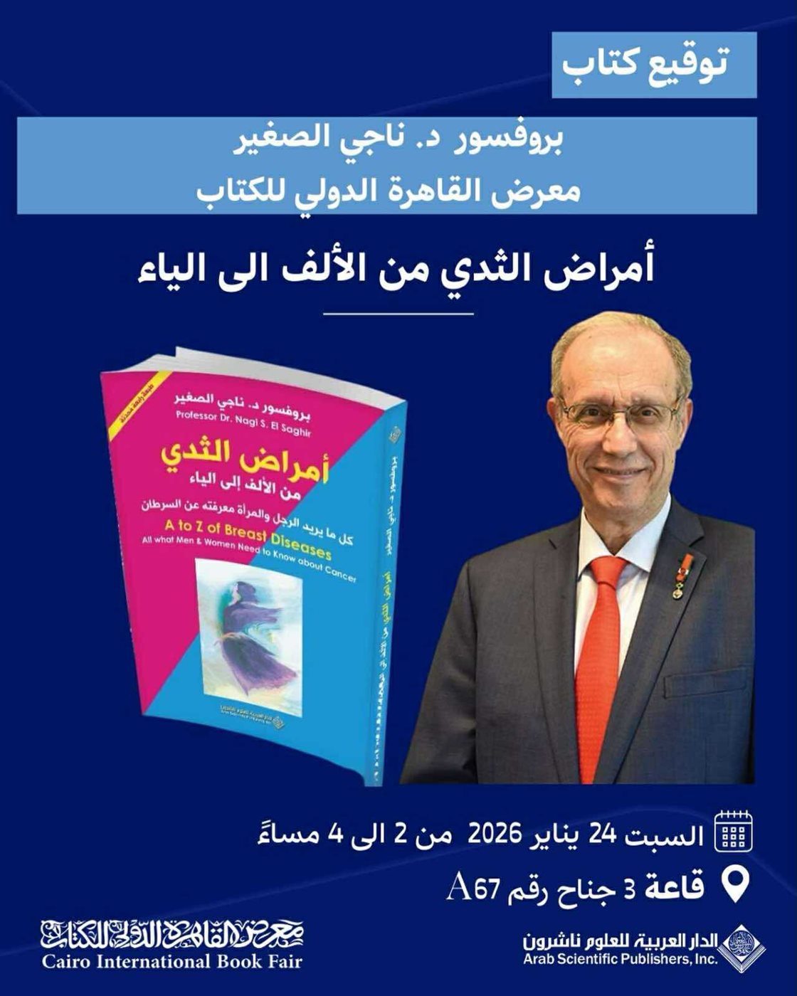 هذا ويقام حفل توقيع كتاب " أمراض الثدي من الألف إلي الياء" يوم السبت الموافق 24 يناير من الساعة 2 : 4 مساءً بتوقيت القاهرة فى جناح الدار العربية للعلوم ناشرون, قاعة ( 3 ) في مركز مصر الدولي للمعارض والمؤتمرات.