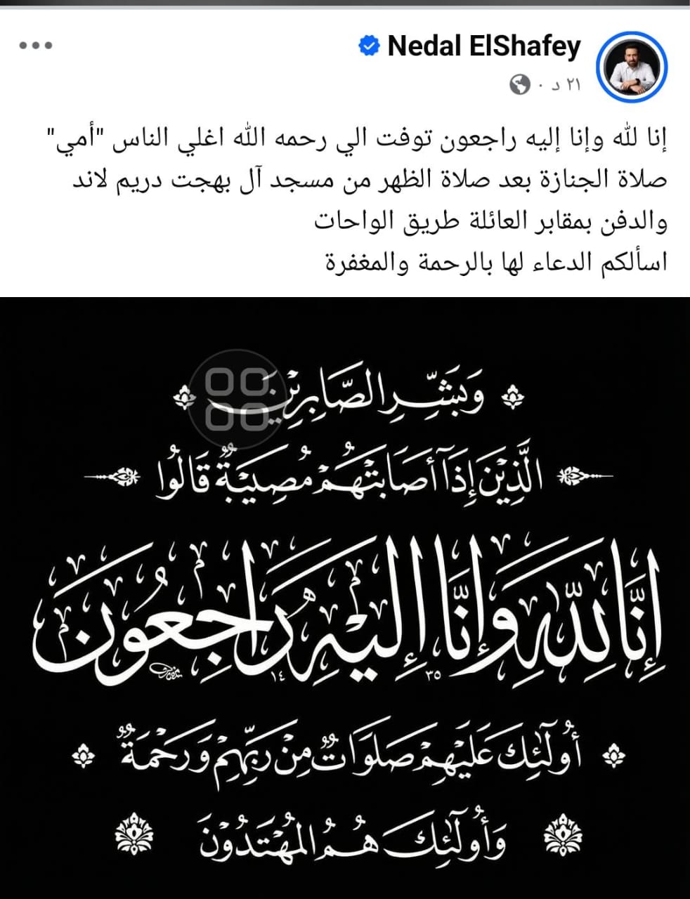 ونشر نضال الشافعي منشورًا عبر حسابه خاص على موقع التواصل الاجتماعي “فيس بوك”، وعلق قائلًا: “إن لله وإنا إليه راجعون توفت الي رحمه الله اغلي الناس أمي".