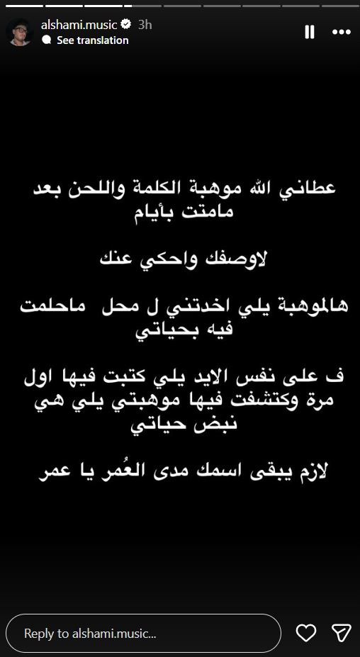 وحرص الشامي على توثيق هذه اللحظة برسالة شاركها مع جمهوره عبر خاصية "الستوري" بحسابه الرسمي على "إنستجرام"، كشف فيها أن الله منحه موهبة الكلمة واللحن بعد أيام قليلة من فقدان شقيقه، مشيرًا إلى عجزه عن التعبير بالكلمات عن مشاعره تجاهه، أو الحديث عنه بالصورة التي يتمناها.