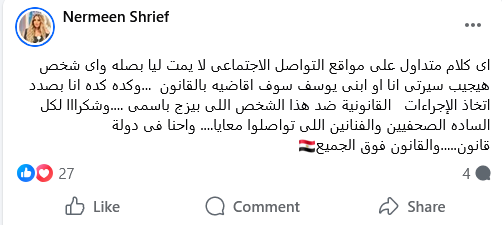 واختتمت الإعلامية نرمين شريف رسالتها مؤكدة أن ملاحقتها القانونية تأتي ضمن إطار الشرعية والقانون، مشددة على أن حماية سمعتها وسمعة أسرتها أمر لا تقبل التفريط فيه، وأن القانون فوق الجميع ويجب احترامه لضمان عدم تكرار مثل هذه التصرفات المسيئة، قائلة: "احنا فى دولة قانون، والقانون فوق الجميع".
