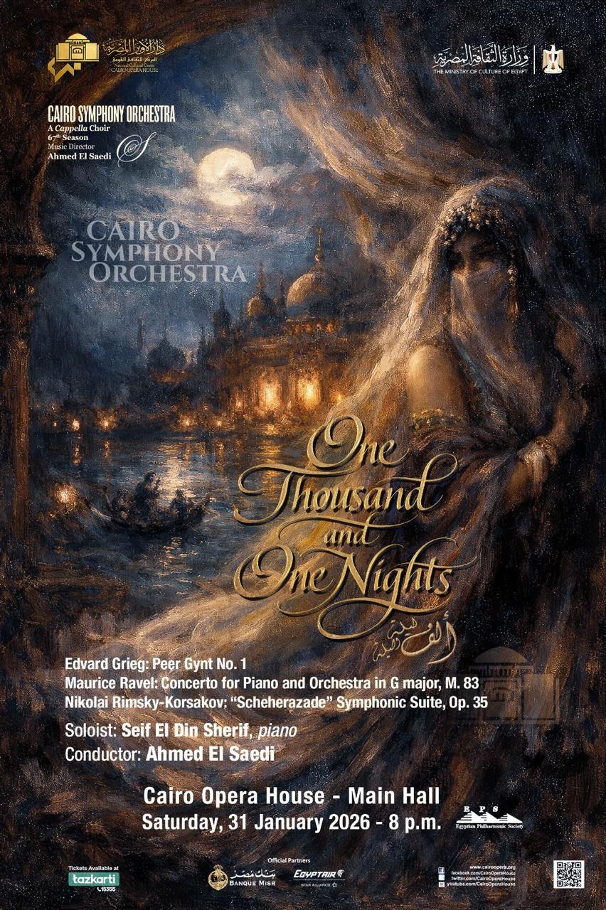 تواصل دار الأوبرا المصرية برئاسة الدكتور علاء عبد السلام تقديم روائع الموسيقى الكلاسيكية العالمية، حيث يحيي أوركسترا القاهرة السيمفوني، بقيادة المايسترو أحمد الصعيدي، وبمشاركة عازف البيانو سيف الدين شريف، حفلاً مميزًا بعنوان «ألف ليلة وليلة»، وذلك في تمام الثامنة مساء السبت 31 يناير على المسرح الكبير.