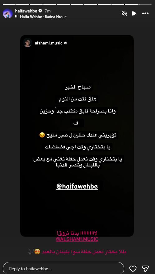 بدأت القصة عبر حساب الشامي الرسمي عبر "ستوري موقع الصور والفيديوهات الشهير "إنستجرام"، مشاركًا متابعيه بمنشور اتسم بالعفوية والجرأة، معبرًا عن مروره بحالة من الحزن، وواضعاً هيفاء وهبي أمام خيارين لتبديل مزاجه.