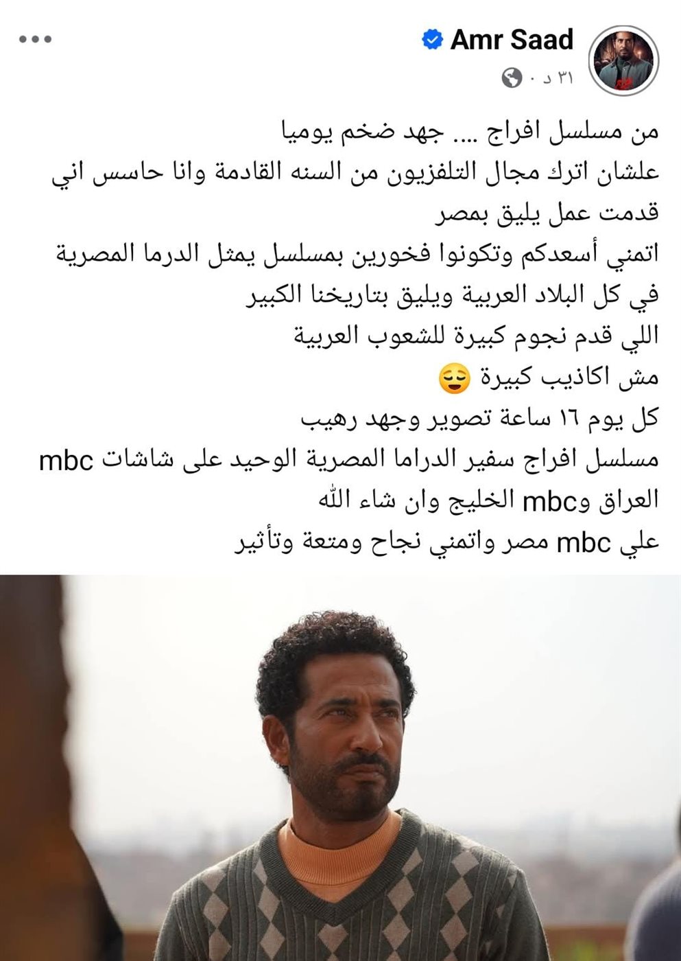 وأضاف: «كل يوم 16 ساعة تصوير وجهد رهيب، مسلسل إفراج سفير الدراما المصرية الوحيد على شاشات mbc العراق وmbc الخليج وأن شاء الله على mbc مصر وأتمنى نجاح ومتعة وتأثير»