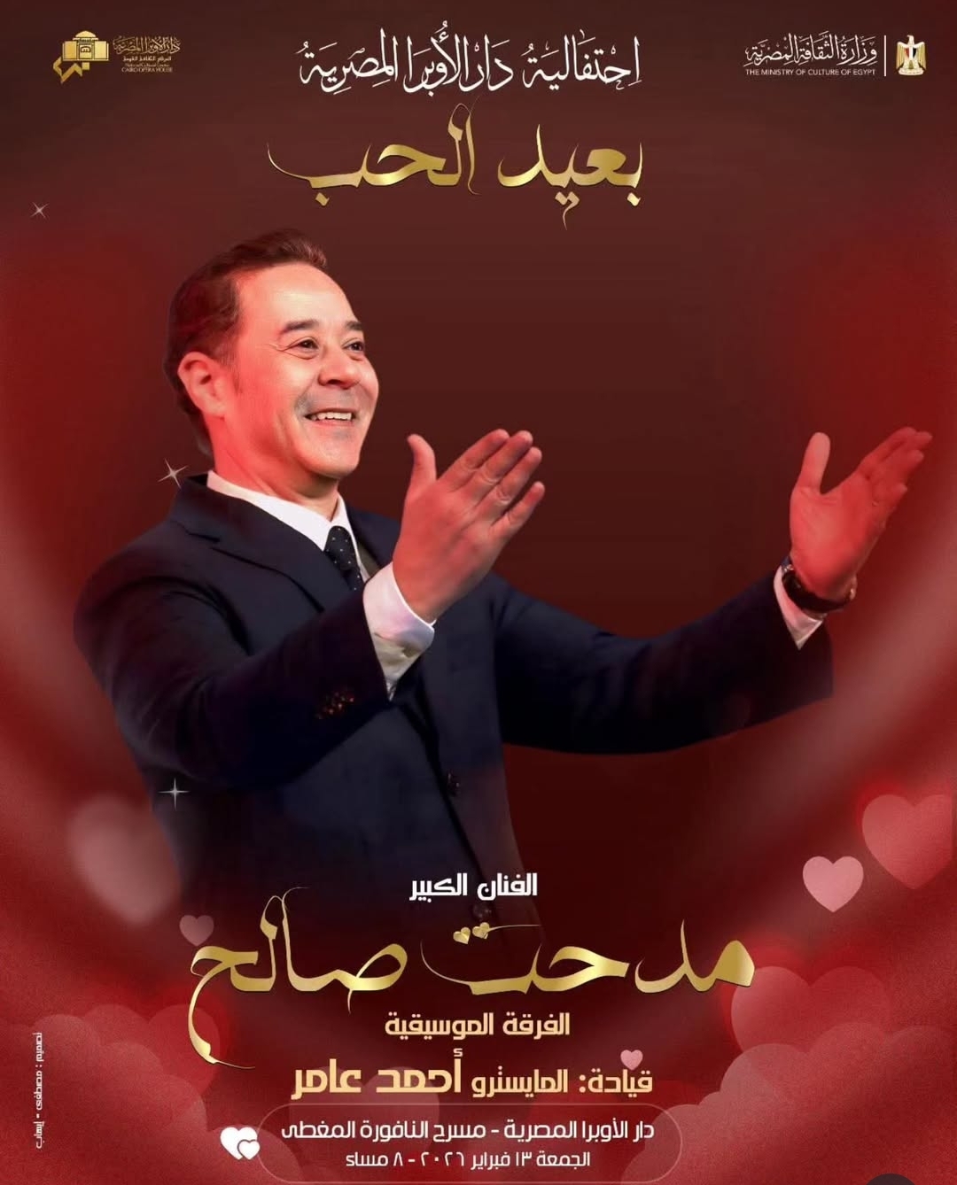 ويأتي حفل عيد الحب بمصاحبة الفرقة الموسيقية بقيادة المايسترو أحمد عامر، حيث يجتمع الأداء الغنائي المميز مع التوزيع الموسيقي الراقي، في ليلة ينتظرها عشاق الطرب الأصيل والأغاني العاطفية.