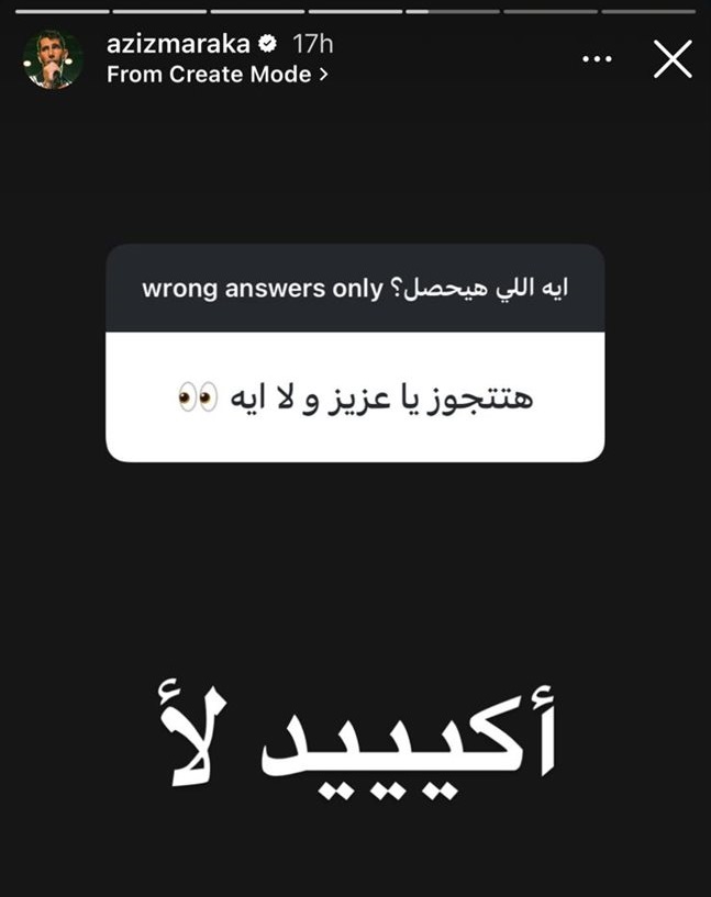 جاء ذلك ردًا على سؤال أحد متابعيه حول إمكانية زواجه في عام 2026، حيث رد على المسدج عبر استوري حسابه الرسمي على إنستجرام، كاتبًا: "أكيييد لا".
