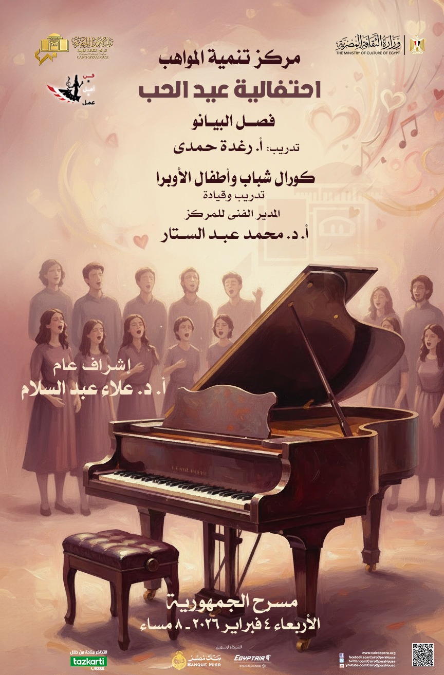 تحتفي دار الأوبرا المصرية بمناسبة عيد الحب بحفل فني مميز يقدمه الواعدون بمركز تنمية المواهب، في إطار دعمها المستمر لاكتشاف الطاقات الشابة وصقلها، وذلك في الثامنة مساء الأربعاء 4 فبراير على مسرح الجمهورية، برئاسة الدكتور علاء عبد السلام، وتحت إشراف المدير الفني للمركز الدكتور محمد عبد الستار.