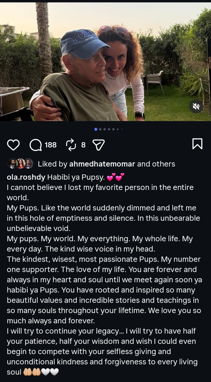 عبرت الفنانة علا رشدي عن حزنها الشديد لوفاة والدها، من خلال منشور مؤثر شاركته عبر حسابها الرسمي على موقع التواصل الاجتماعي إنستجرام، كشفت فيه عن حجم الفقد الذي تعيشه بعد رحيله، مؤكدة أنه كان أغلى وأقرب شخص إلى قلبها.