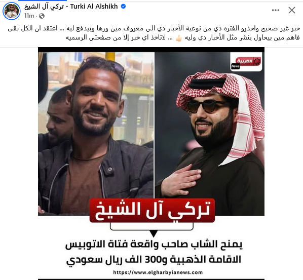 وقال، تعليقًا على المنشور المتداول بشأن مزاعم مكافأة الشاب: «خبر غير صحيح، واحذروا خلال هذه الفترة من مثل هذه الأخبار، فالمعروف من يقف وراءها ولماذا. أعتقد أن الجميع أصبح يدرك من يحاول نشر مثل هذه الشائعات ولأي غرض».